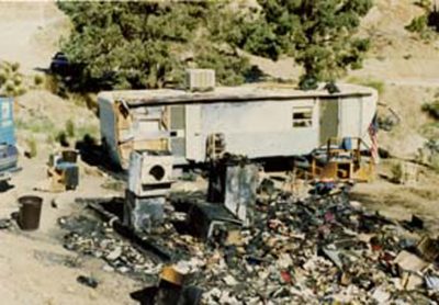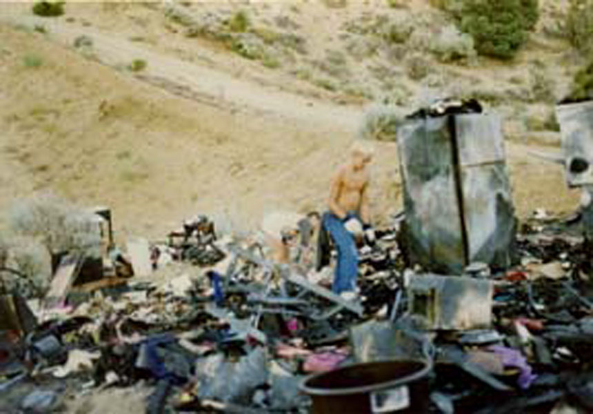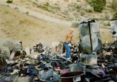 The rest of what happened is in slow/fast motion like in a movie. I think I had Keri call 911; she had trouble telling them where we were because there was no house so we didn’t have an address for her to give to the 911 operator. When our closest neighbor Jeff and his friends came, they started moving the motorcycles, which were sitting in front of the trailer, I think. When they did that Randy’s attention was diverted to that task, which is when he noticed the propane tank on the front of the trailer. He moved the truck and I must have moved the car up onto the road, all the while he is still trying to get things out of the shed and I must have been just getting more and more panicky bordering on hysteria, so Randy had Brian take me and Keri over to where the truck had been moved, to get me away from the fire. I know I became very hysterical at one point and I got very upset with the cop that showed up before the fire department. At the time, all I could see was that everything we owned was going up in flames and he was just standing there watching the fire. I remember yelling at him, “why aren’t you doing something?” his response was, “it isn’t my job to fight a fire”. Randy remembers me hitting him too…I’m not very proud of that, it must’ve been his follow-up comment which was “does it look like I’m dressed to fight a fire?” Three fire companies came, it seemed like it took them an eternity to get there. Wrightwood Fire Dept. was first, then Pinon Hills CDF and Phelan CDF, but it was too late, everything was gone by the time they got there. I was so relieved to see the firemen. And although they got the fire out fast, all our stuff was just a black smoldering heap. After the fire was out they took out their axes and bashed everything and hosed more water on and took shovels and threw dirt on the heap. I’m sure that is what needs to be done to make sure a fire is all the way out, but it’s hard to watch someone bash your things, which you’re hoping, may not have been completely destroyed by the fire, into just a pile of wreckage. All of our things and memories too, photo albums, the kids baby books, furniture (fortunately we still had the furniture that came with the trailer), the cradle Bill made for me when I was pregnant with Keri, that both the kids slept in, new washer/dryer, king size brass bed, refrigerator (I was so proud of that purchase, but that’s another story) all the Christmas ornaments the kids had made over the years, the heirloom Christmas ornament that had hung on the tree my whole childhood, my mom had just given it to me the year before for Christmas, it had hung on her childhood Christmas trees, and was given to her by her mother, when she moved to Hawaii to marry my dad, I never got to hang it on one of my trees, Randy’s antique camera collection, books, and so many things I don’t normally let myself try to remember. All those things, the practical and the sentimental, strangely didn’t seem very important at the time, we lost all our clothes, and you can’t do much, naked. Randy, Keri and I still had a few things, mostly work and play clothes, left in the trailer, but all of Brian’s clothes were gone, he had his bed and dresser in the shed, so all he had to wear were the boxers he was wearing when the fire started.