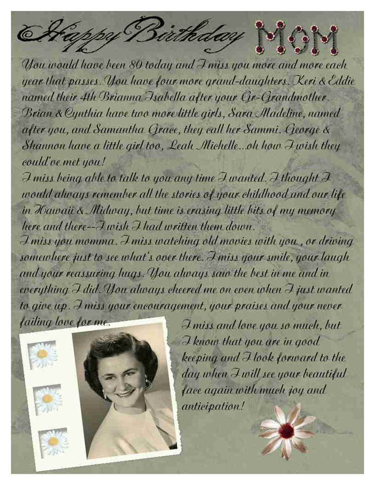Happy Birthday Mom September 17th 1931 LeiLei September 17, 2011 Happy Birthday Mom September 17th 19312011-09-17T14:07:25+00:00 Lei's Scrapbook Pages No Comment